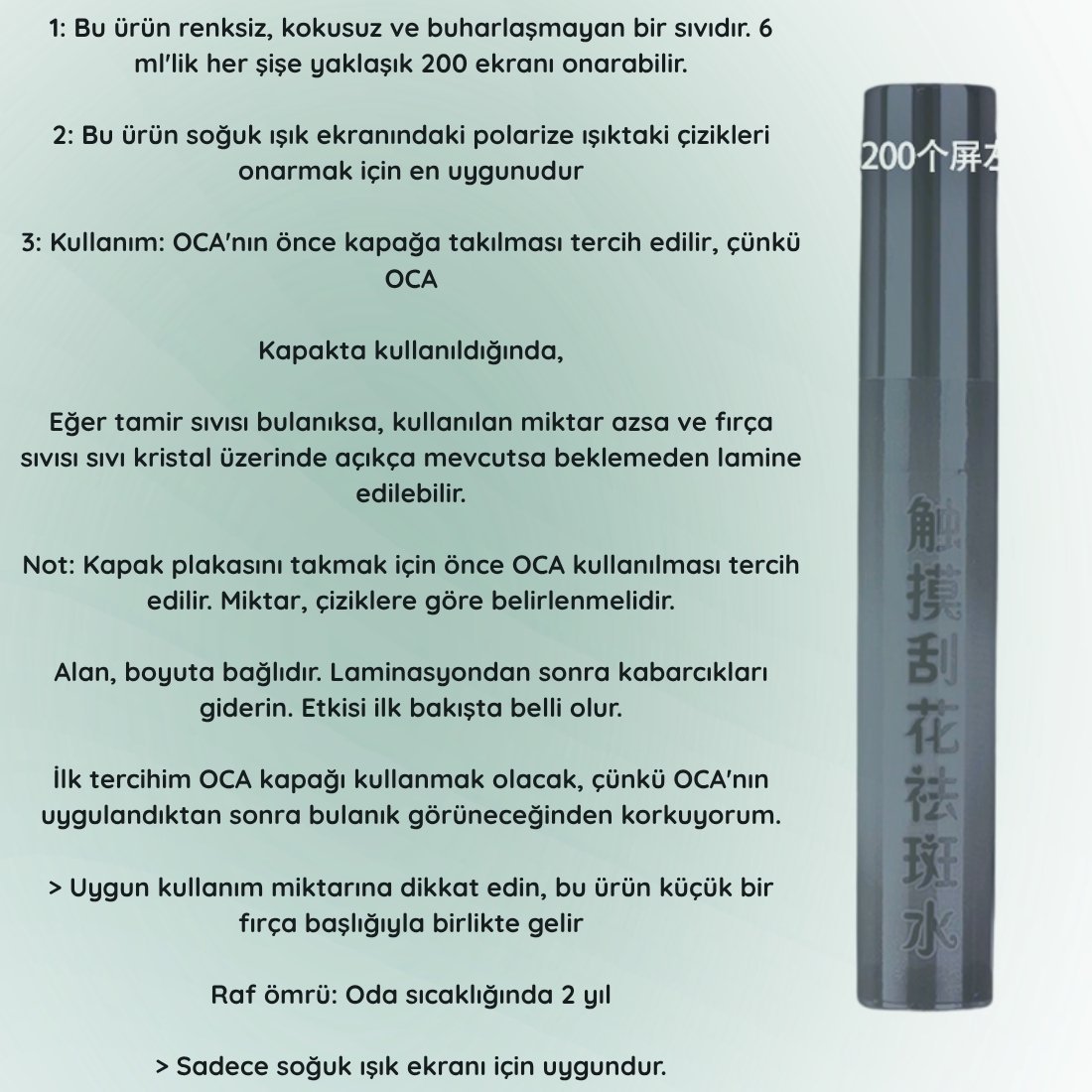 Polarize Çizik Giderici Kalem SıvıPolarize çizik giderici kalem, ekran ve cam yüzeylerdeki ince çizikleri doldurmak ve görünürlüğünü azaltmak için özel olarak geliştirilmiş bir üründür. İçeriğinde bulunan mikro partiküller, çiziklerin içine dolarak yüzeyin daha pürüzsüz ve parlak görünmesini sağlar. Özellikle polarize camlarda ve ekranlarda kullanıma uygundur.TKNK134
